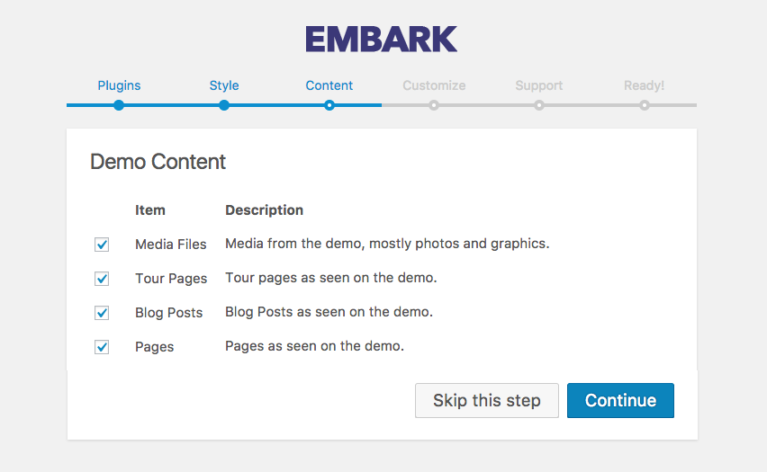 Getting started is easier with demo content. We recommend checking all boxes as you can always choose to remove content from within WordPress after setup.